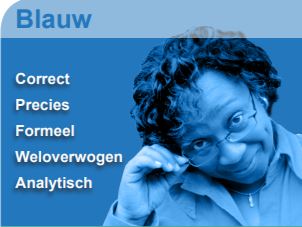 Blauw tenslotte staat voor correct en precies gedrag. Mensen met een Blauw persoonsprofiel houden van structuur, regels en duidelijkheid. Het zijn denkers die zaken analyseren voordat ze een beslissing nemen. Ze gaan zorgvuldig te werk en gruwelen van de nonchalance van bijv. de ‘Gele’ types. Ze vinden het soms ook lastig om kritiek te krijgen.