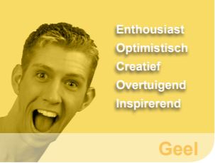 Geel typeert creativiteit, optimisme. Mensen met een Geel profiel zijn extravert en mensgericht, gaan gemakkelijk contacten aan. Ze houden van gezelligheid. Uitbundig en creatief als ze zijn, hebben ze vaak een hekel aan regels en kaders. Ze denken liever ‘Out of the box’. Ze staan graag in het middelpunt en vinden het niet prettig om genegeerd te worden.