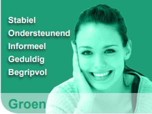 Groen staat voor eigenschappen als: betrouwbaar, stabiel en gericht zijn op de ander. Communicatie is zeer belangrijk en ze weten zich goed in de ander te verplaatsen. Het zijn de zgn. “mens-mensen”. Als zodanig zijn ze ook wat meer introvert en hebben ze veel moeite met types die gaan voor resultaat en hierbij minder stilstaan bij menselijk aspecten.