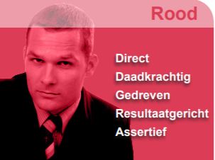 Rood representeert daadkracht, focus en doelgerichtheid. Mensen die als ‘Rood’ worden getypeerd, zijn gedreven, resultaatgericht, extravert en gefocust op winnen. In communicatie met anderen zijn ze direct, sturend en soms (te) kort door de bocht. Ze zijn niet bang voor confrontaties en hanteren regelmatig de uitspraak: “Wrijving maakt glans”.